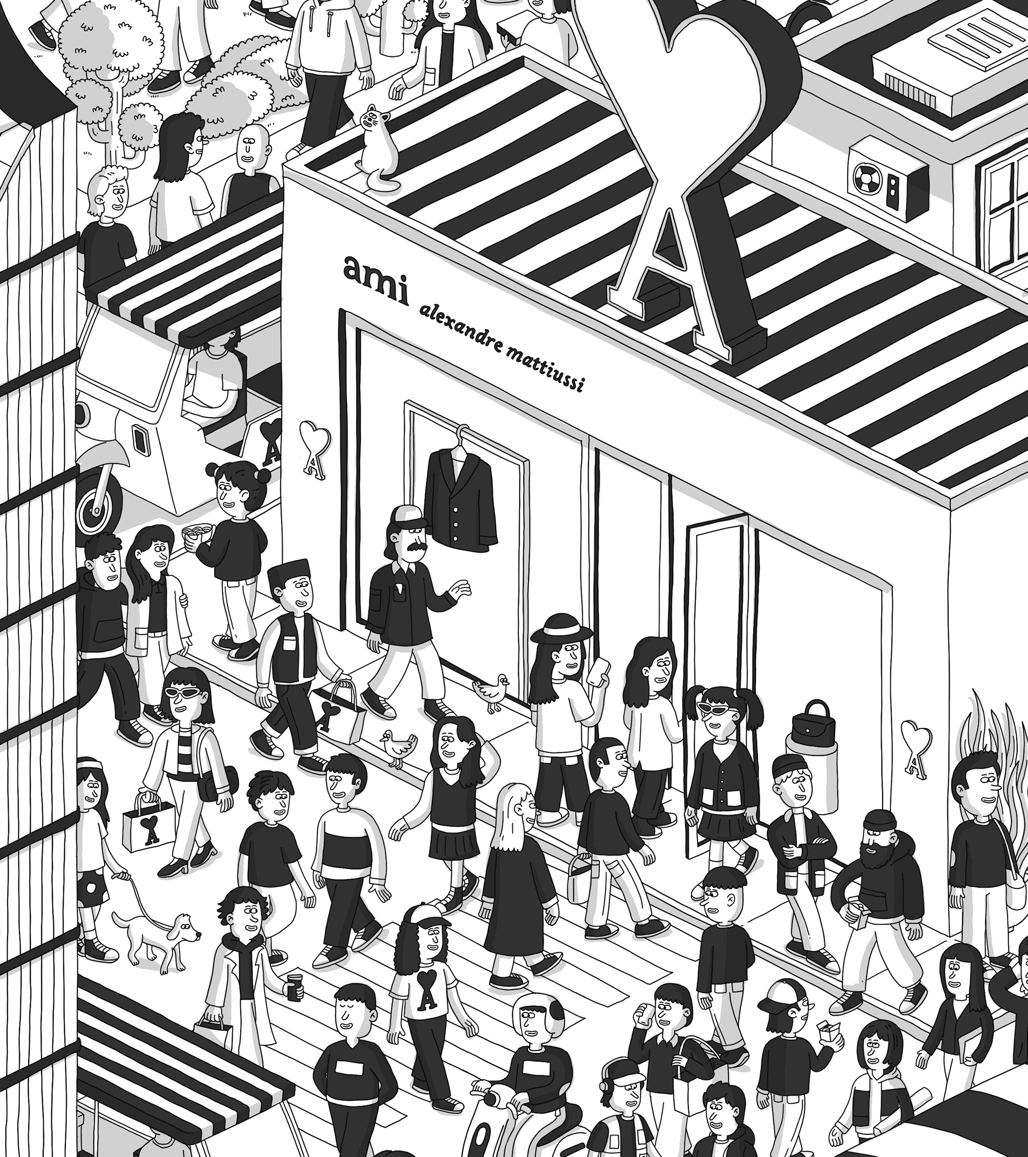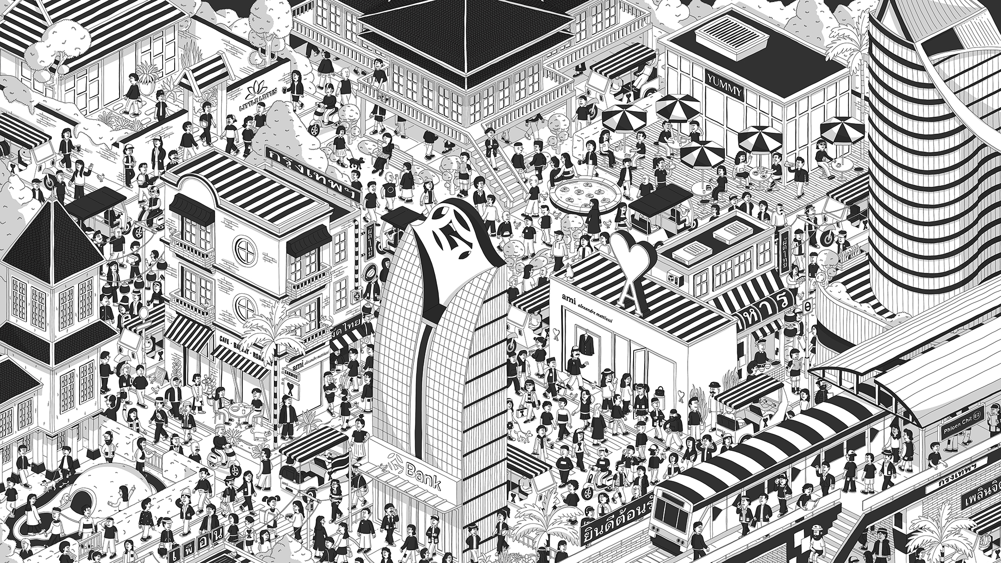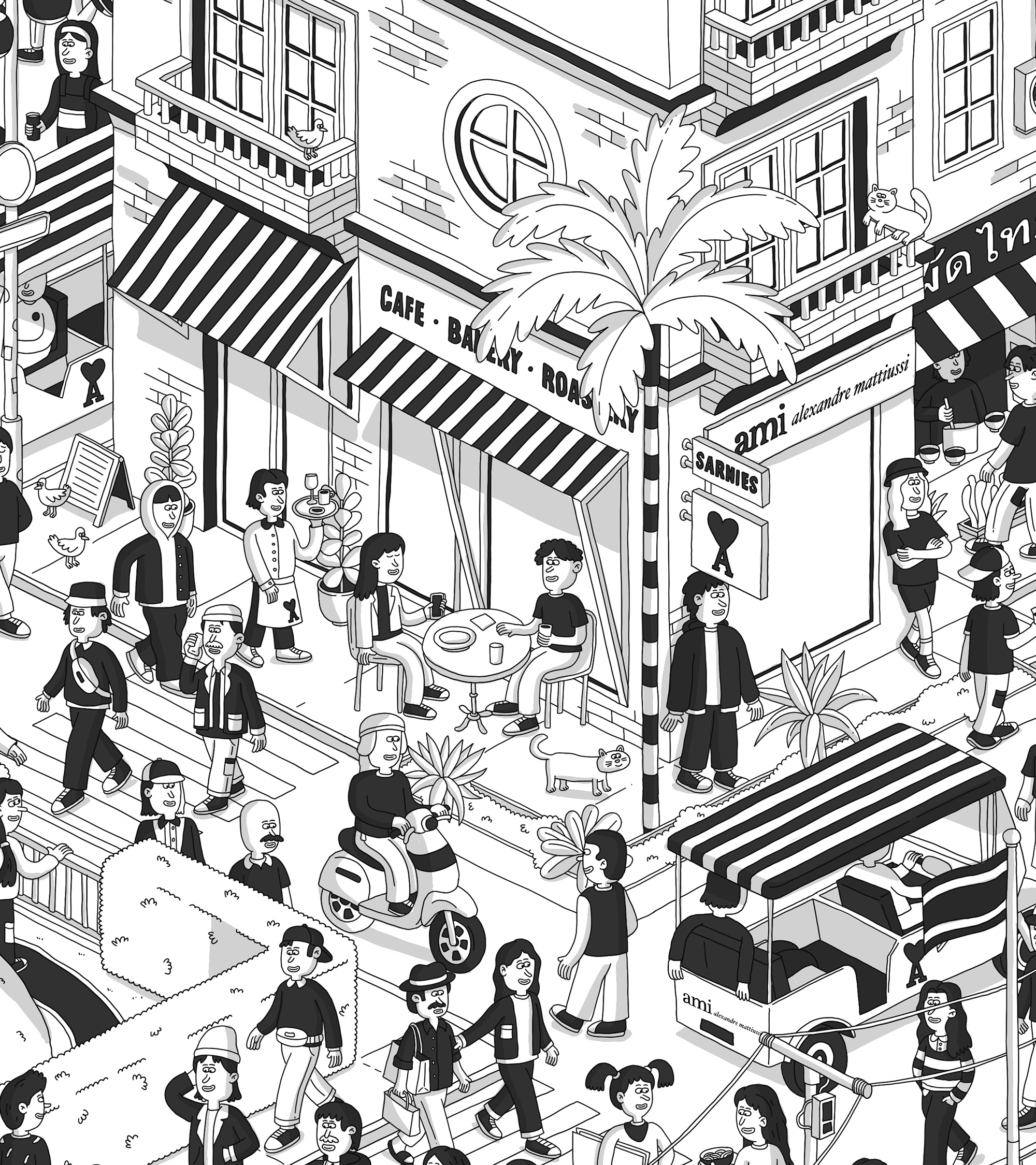 AMI Paris opened its new store in Bangkok, and to celebrate the occasion, collaborated with Sarnies Roastery café. I was commissioned to create the illustration for the interactive game “Ride with AMI”, launched on the brand’s website — a visual treasure hunt where players had to find nine AMI-branded tuk-tuks hidden in my artwork.