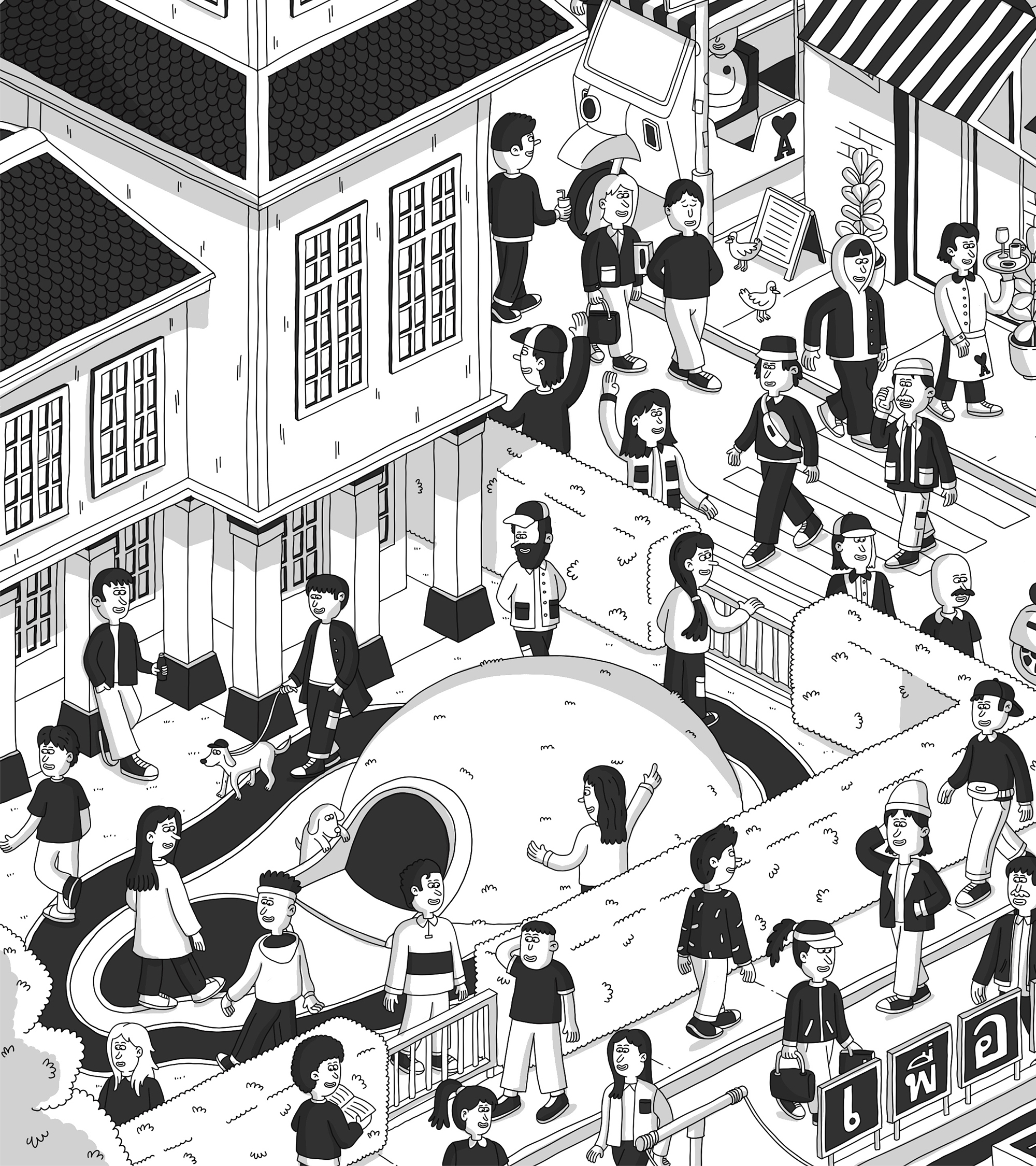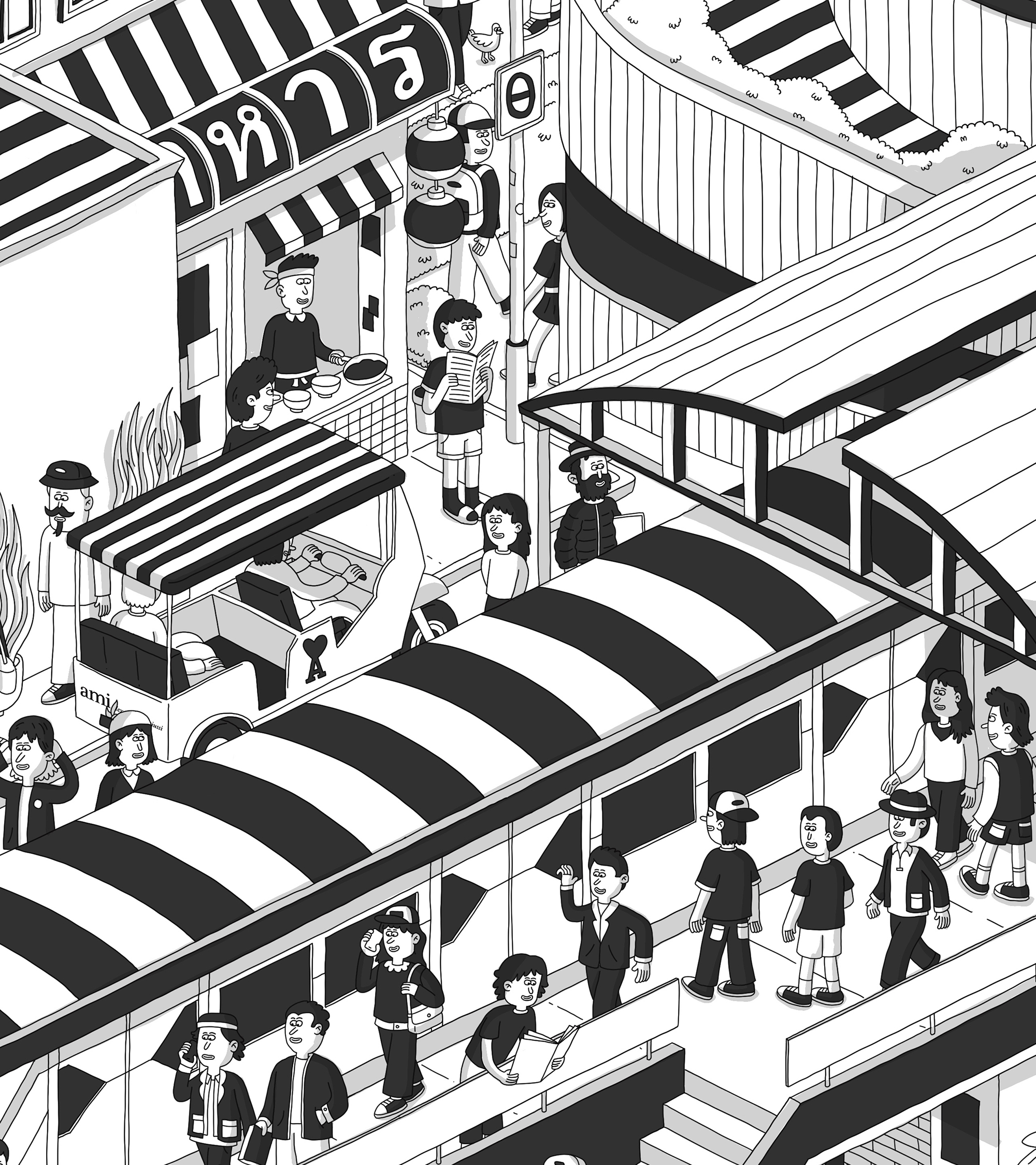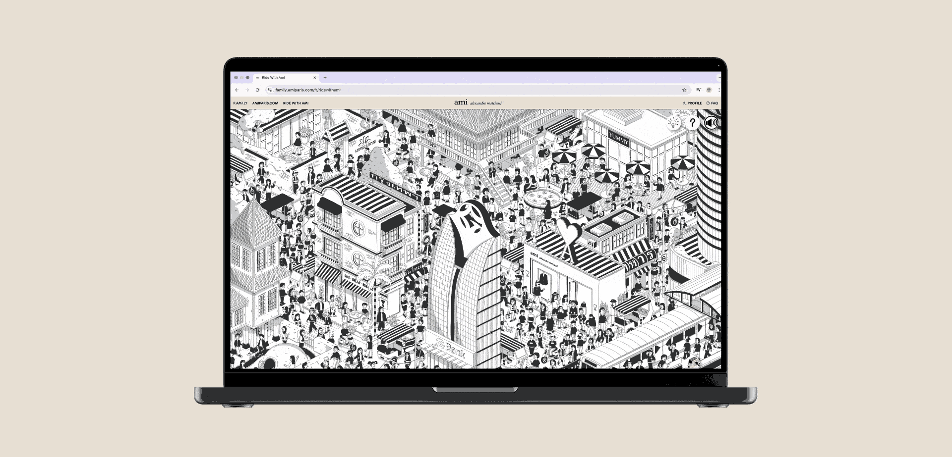AMI Paris opened its new store in Bangkok, and to celebrate the occasion, collaborated with Sarnies Roastery café. I was commissioned to create the illustration for the interactive game “Ride with AMI”, launched on the brand’s website — a visual treasure hunt where players had to find nine AMI-branded tuk-tuks hidden in my artwork.