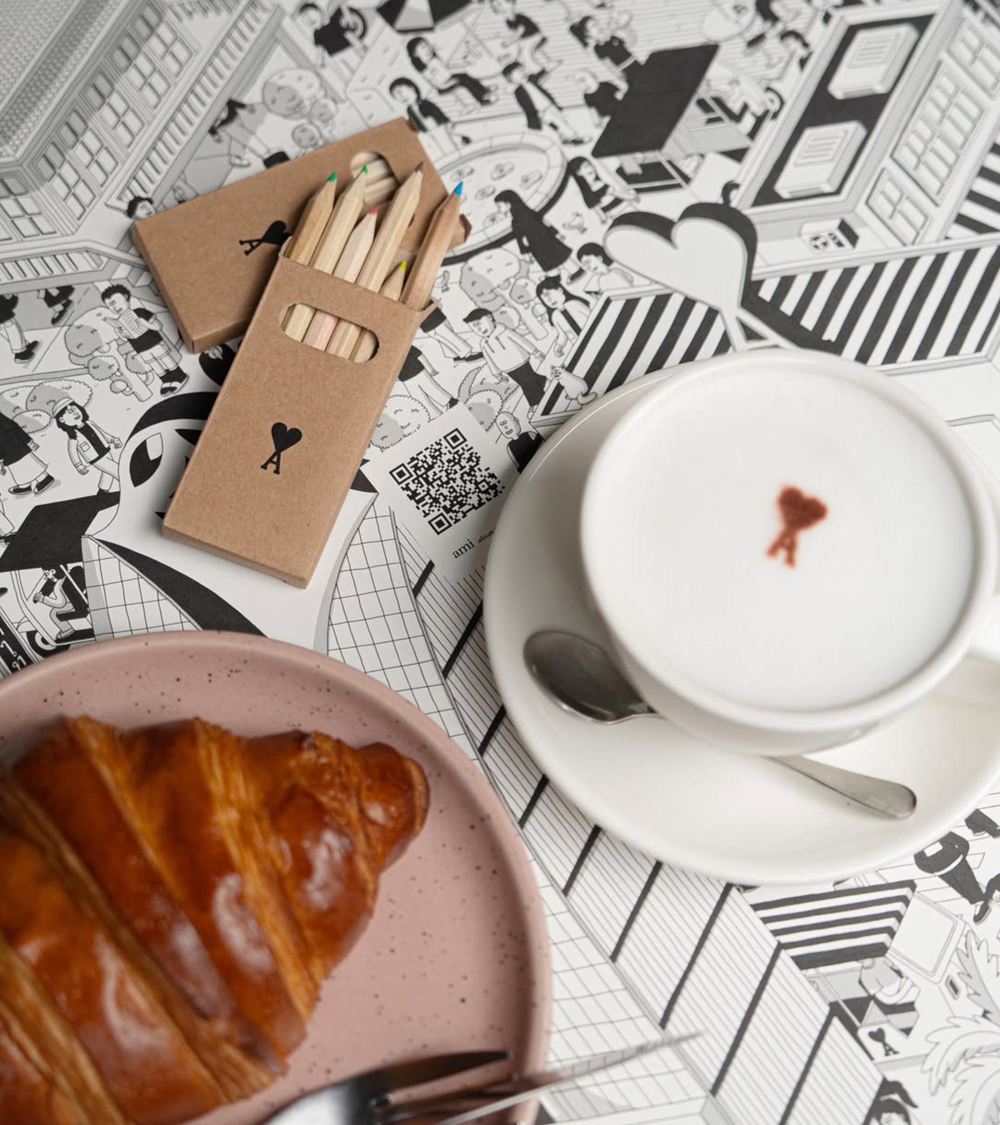 The illustration features the AMI store, the Sarnies café, and iconic buildings from the neighborhood, woven together in a lively urban scene. My artwork was also displayed throughout the Sarnies café, printed on tables and placemats, each featuring a QR code linking directly to the game. Participants could win prizes and discount vouchers by taking part.
